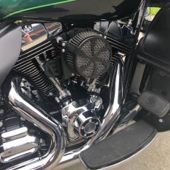 The accessories that have been added are as follows; HD Tinted Windsplitter windshield, HD Chrome Windshield Trim, HD Chrome Gauge Trim Kit, HD Adjustable Hwy pegs, HD Riders Backrest, HD Chrome Tour[ak tqil light tim, HD Smoked LED Tail light, HD Chrome Passenger Floor board coversHD Electro-Glo saddlebag LED filler lights, 4” Rinehart Chrome Mufflers and a Custom Stage 1 Air Cleaner Kit